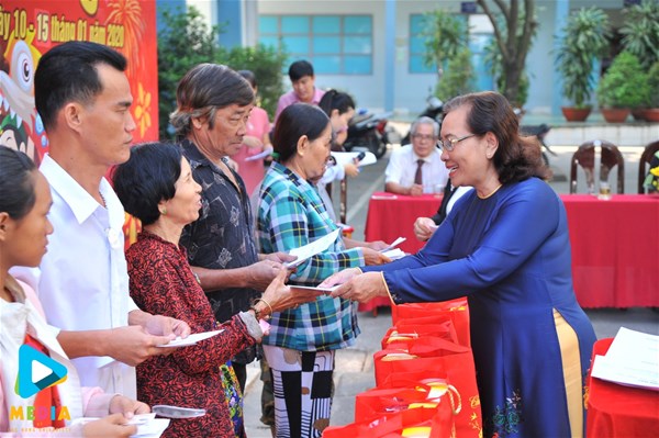 NGƯT TS. Nguyễn Thị Thu Lan trao quà và tiền mặt đến các hộ nghèo Phường Bửu Long