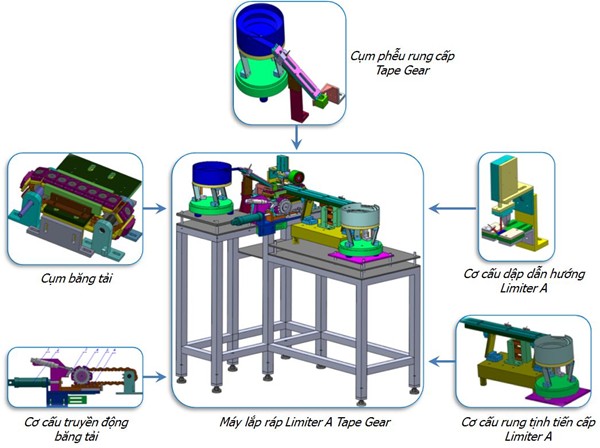 Máy lắp ráp Limiter A Tape bao gồm các tổ hợp cơ khí - truyền động thành phần với các chức năng khác nhau:
