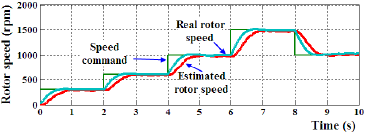 Step speed command, real rotor speed and estimated rotor speed response in experiment by FPGA kit