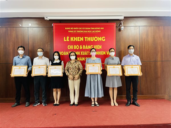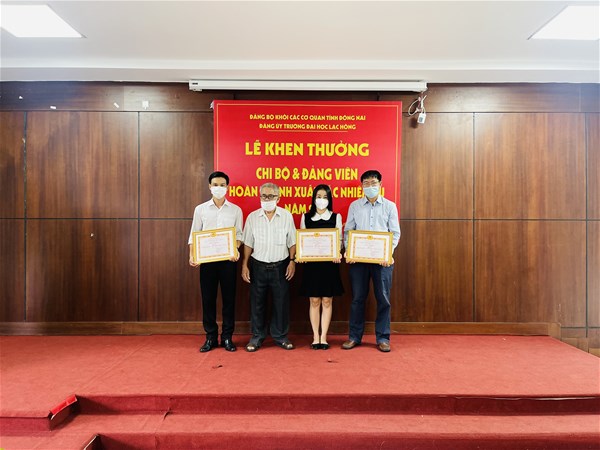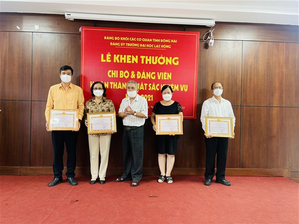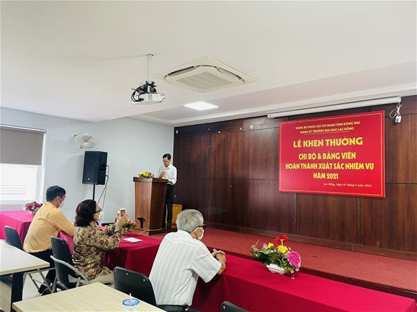 Sáng 01/4/2022 tại Hội trường B203, Cơ sở 1, Đảng ủy Trường Đại học Lạc Hồng đã tổ chức Lễ trao tặng các khen thưởng đối với các Chi bộ và cá nhân Đảng viên đã hoàn thành xuất sắc nhiệm vụ công tác Đảng năm 2021. Dự Hội nghị có đồng chí Nguyễn Trùng Phương - Bí thư Đảng ủy nhà trường; NGƯT. TS Nguyễn Thị Thu Lan - Phó Bí thư Đảng ủy, Phó Hiệu trưởng nhà trường; đại diện các Chi bộ Đảng trong toàn trường và các cá nhân Đảng viên tại các chi bộ đã có thành tích hoàn thành xuất sắc nhiệm vụ công tác Đảng trong năm 2021.