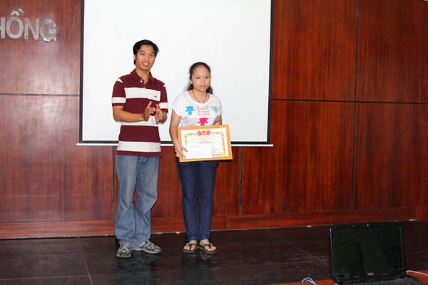 Bạn Vũ Thị Bảo Trinh nhận phần thưởng và bằng khen của Giải Nhất