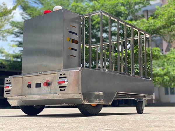 The robot is powered by two motors on the rear wheel, has a remote-control range of 200 meters, and is equipped with a direct microphone connection by WiFi or 3G. With dimensions of 890mm wide x 1,250mm long x 790mm high, they charge in four hours and operate continuously for three to four hours, transporting a mass of 100kg of products on level terrain. The robot's completion will cost 60 million VND and will take seven days to finish.