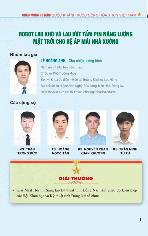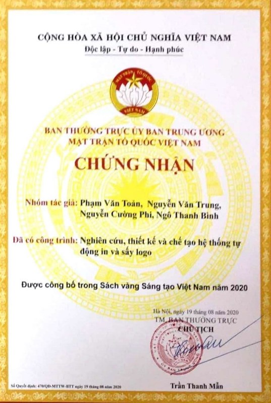 In the academic year 2020 - 2021, lecturers and students of the Faculty of Mechatronics and Electronics, LHU are honored to have two scientific and technological solutions printed in the Vietnam Innovation Yellow Book 2020. Accordingly, two solutions were selected including "Wet and dry cleaning robot for solar panels for the factory roof system" of authors Le Hoang Anh, Tran Trong Duc, Hoang Ngoc Tan, Nguyen Phan Xuan Khuong and Tran Minh Tu Tu and "Research, design and manufacture automatic logo printing and drying system" of authors Pham Van Toan, Nguyen Van Trung, Nguyen Cuong Phi and Ngo Thanh Binh.