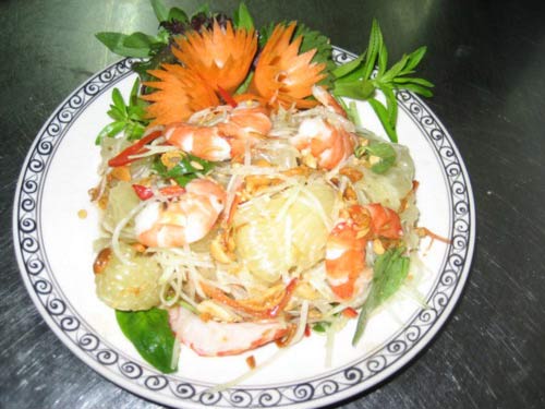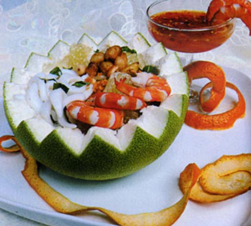 Bien Hoa’s people also create many special dishes from pomelos like goi buoi, pomelo juice, and pomelo wine, pomelo sweet soup, pomelo roll… In particular, goi buoi is famously delicious because all ingredients are home-grown, simple and easy to find. People use Thanh pomelos (little water, crisp, sour and slightly sweet) to make goi buoi (pomelos mixed with shrimp caught from Dong Nai river, rau thom (kinds of vegetables that have smell), ground peanuts, pork meat, carrot, pepper, sugar, fish sauce, garlic, chili,…). People can enjoy goi buoi with young pomelo leaves, baked girdle cakes, bringing their appetite due to light sour, sweet, spicy, and buttery tastes of all ingredients.