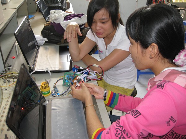 Thành viên Nguyễn Kim Nhạn và Nguyễn Ngọc Mai Thanh Mỹ đội LH-ZO2T tham gia cuộc thi Robocon 2012