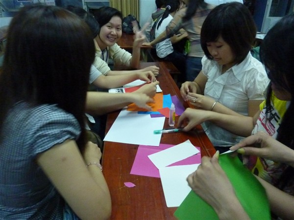 皆は一緒に食品の形のように色紙で破って、白い紙に貼った