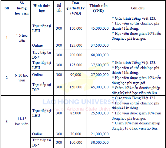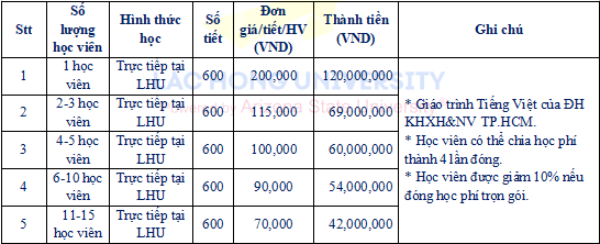 2.2 Học phí các lớp tiếng Việt