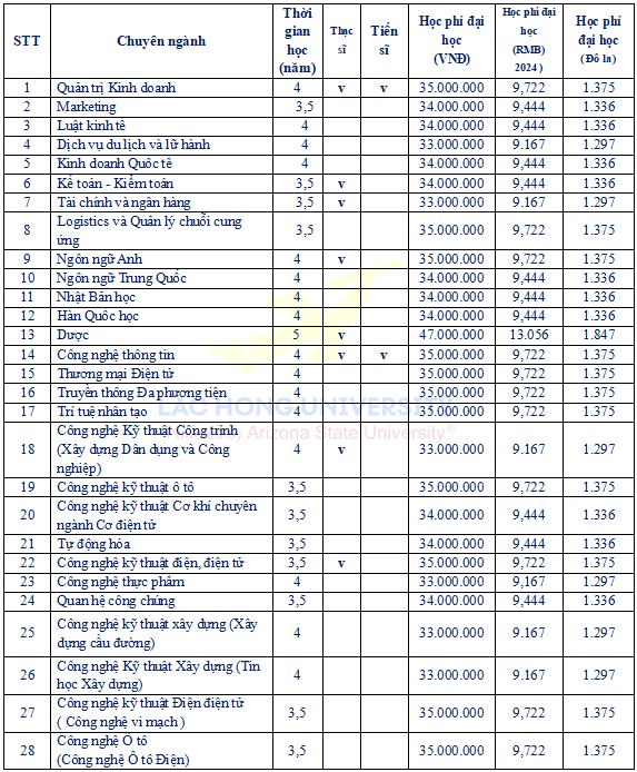 Có thể đăng ký chương trình đào tạo tiếng Việt 1 năm hoặc lớp ngắn hạn (2 tháng/khoá tổng 5 khoá, lớp 1 học kỳ) và lấy chứng chỉ từ “Chương trình đào tạo tiếng Việt” của Đại học Lạc Hồng.