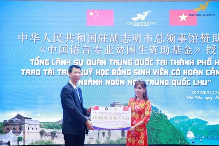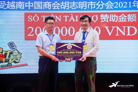 Master. Phan The Anh - Head of the Chinese Language department, representing the university to receive scholarship funding from the Chinese Entrepreneurs Association in Vietnam, Ho Chi Minh City Chapter