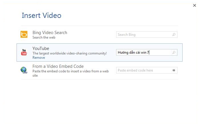 Tại cửa sổ “Insert Video” bạn sẽ được lựa chọn 3 nội dung để chèn video trực tuyến.