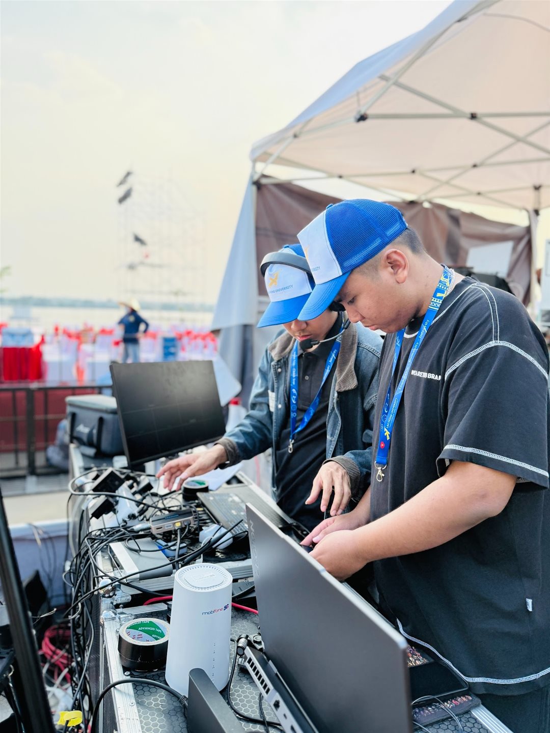 In the days leading up to the Tran Bien Countdown, the backstage area has been in a state of constant activity. Sound checks, lighting demos, signal testing, and various technological devices are operating around the clock. Amidst this bustling environment, students and alumni from Lac Hong University (LHU) are directly managing several key technical and media components, contributing to the creation of a modern and professional community event.