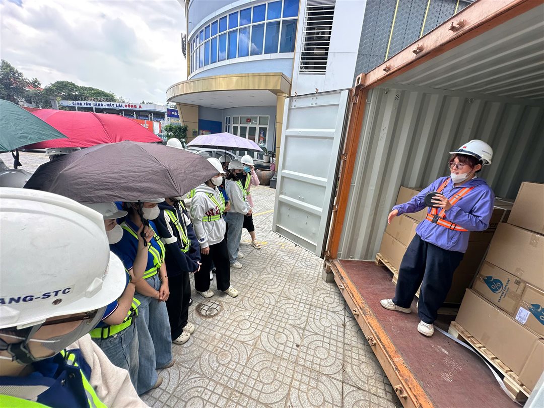 The delegation then proceeded to specialized areas such as the rice handling zone, the CFS warehouse (Container Freight Station), and notably the customs inspection area. Here, students were given a detailed introduction to the procedures for preparing a shipment for customs inspection, the related documentation, and the role of customs authorities in ensuring cargo security and safety.