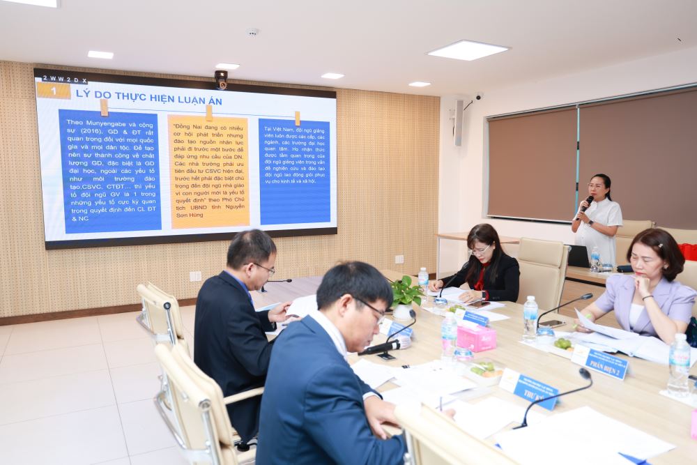 Doctoral candidate Duong Thi Phuong Hanh successfully presented the key arguments of her dissertation titled: "Factors affecting work motivation of university lecturers in Dong Nai."