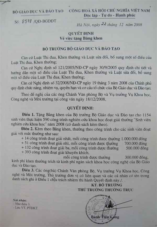 Nghiên cứu khoa học sinh viên cấp Bộ năm 2008